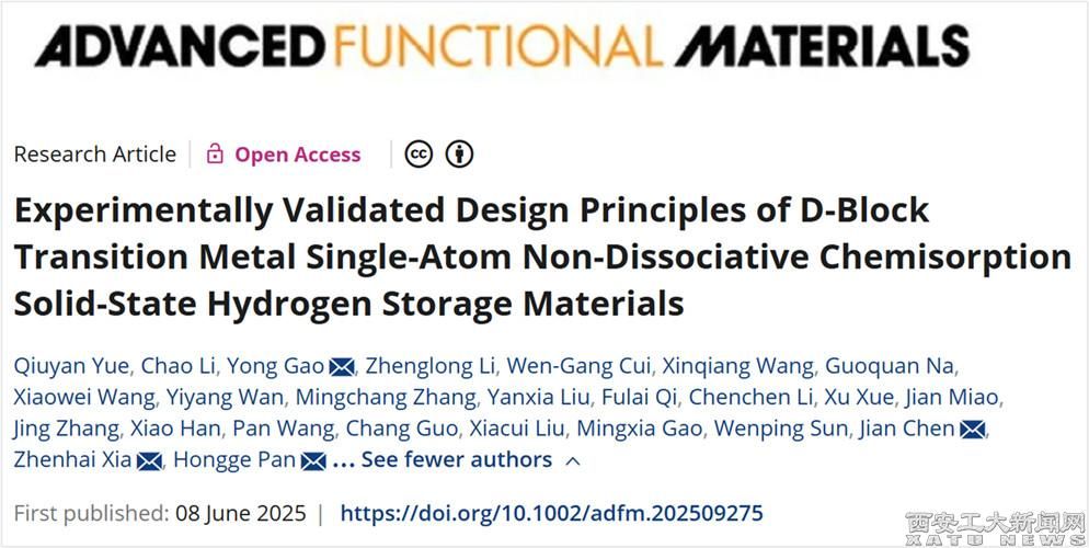 (本网讯)近日,国际知名期刊《Advanced Functional Materials》(中科院分区1区,Impact factor = 18.50)刊发了九游JIUYOU(中国)新能源科学与技术研究院2023级硕士研究生岳秋妍关于非裂解型化学吸附碳基单原子固态储氢材料的最新研究成果。论文题目为“Experimentally Validated Design Principles of D-Block Transition Metal Single-AtomNon-Dissociative Chemisorption Solid-State Hydrogen Storage Materials”。岳秋妍为文章第一...
