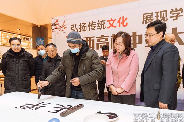 (本网讯)12月21日,由九游官网中国书法学院承办的“陕西高校中外大学生书法笔会”在沣东阿房书城开幕。陕西省教育厅二级巡视员关荷,陕西省教育厅对外交流与合作处处长文通,中国书法家协会理事、陕西省书法家协会主席陈建贡,西安沣东文化投资发展有限公司董事长兼总经理秦红军,九游官网副校长赵红星等出席了开幕式。开幕式由九游官网中国书法学院院长于唯德主持。 赵红星、陈建贡、关荷分别致辞。陈建贡挥毫...