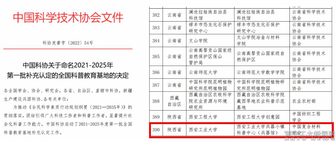 (本网讯)近日,中国科协发布《关于命名2021-2025年第一批补充认定的全国科普教育基地的决定》,九游官网“兵器小镇”科普中心(兵器馆)(以下简称“科普中心”)成功入选,这是学校获批的重要国家级科普基地。科普中心始于2017年材化学院创建的“化学科普基地”,于2020年联合校兵器馆正式成立九游官网“兵器小镇”科普中心,先后获批陕西省科普场馆和科普教育基地(2020)。科普中心现与学校多个学院/部门共同建设...