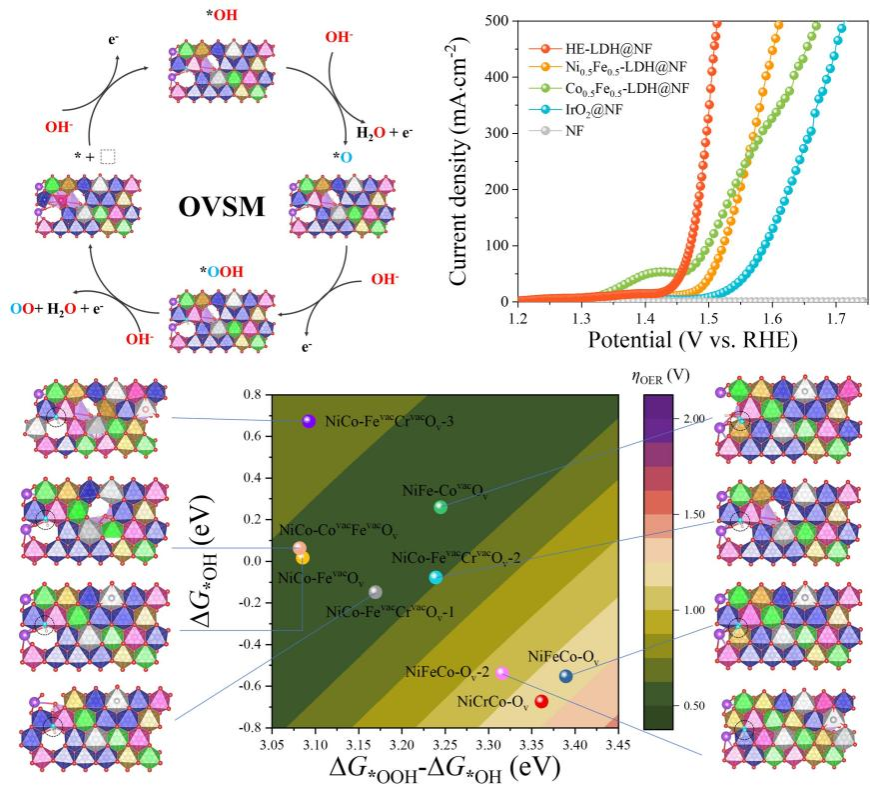 (本网讯)近日,九游JIUYOU(中国)姚尧教授团队在国际顶级期刊《Advanced Energy Materials》(近五年影响因子为27.3)上发表“Deciphering the Synergy of Multiple Vacancies in High-Entropy Layered Double Hydroxides for Efficient Oxygen Electrocatalysis”的研究型论文。如何调控晶格氧氧化机制活性与稳定性之间存在的固有矛盾,成为当前碱性电解水制氢技术发展的核心问题。论文基于理论计算及原位电化学分析,阐明了多种金属空...