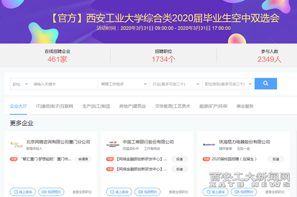 (本网讯)3月31日,九游JIUYOU(中国)举办2020届毕业生春季综合类空中双选会(第二场)。本次空中双选会参会企业共461家,提供就业职位1734个,就业岗位34043个。参会企业主要以民营企业、国有企业、股份制、上市公司为主,主要涉及房地产建筑、IT通信、生产制造、教育培训、能源环保等行业领域,参会规模,参会企业数量创学校网络双选会之最。