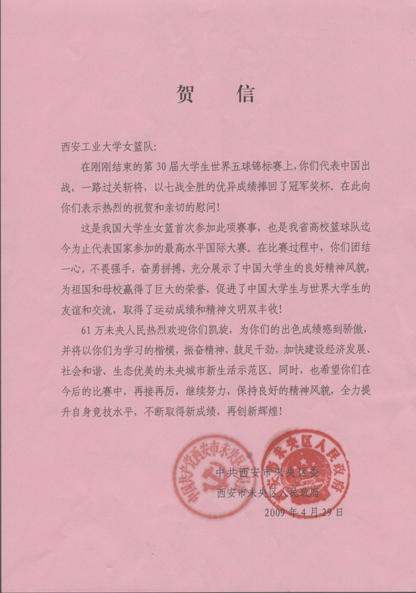 贺信中说:这是我国大学生女篮首次参加此项赛事,也是我省高校篮球队迄今为止代表国家参加的最高水平国际大赛,61万未央人民热烈欢迎你们凯旋,为你们的出色成绩感到骄傲,并将以你们为学习的楷模,振奋精神,鼓足干劲,加快建设经济发展、社会和谐、生态优美的未央城市新生活示范区。同时,也希望你们在今后的比赛中,再接再厉,继续努力,再创新辉煌!