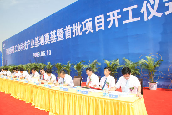 上午10时,奠基仪式正式开始。军乐齐鸣,锣鼓喧天。胡问鸣书记主持奠基仪式;西北兵工局局长刘建民介绍了基地建设的基本情况;陈宝根市长、吴登昌副省长、张国清总经理、黄强副局长等分别致辞;袁纯清省长最后宣布西安兵器工业科技产业基地奠基暨首批项目开工。随后,参会领导一起走到奠基石前培土奠基。