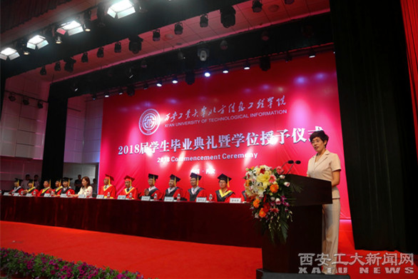 (本网讯)7月3日,西安工大北信学院2018届学生毕业典礼暨学位授予仪式在蹈和文体馆隆重举行。西安工大副校长刘卜、卡普顿大学负责人Mandy女士、北信学院全体院领导、毕业生家长代表、生源地校长及校友代表、2018届应届毕业生共同参加本次毕业典礼。