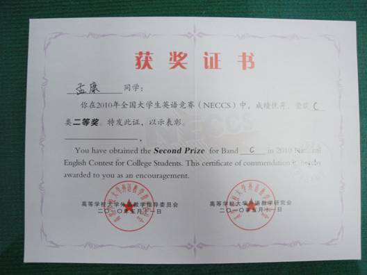 (本网讯)九游官网计算机学院08级信息对抗专业学生孟康同学,由院系推荐,经过了层层选拔参加了2010年全国大学生英语竞赛(NECCS),荣获C类二等奖。