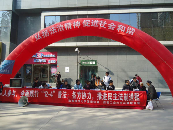 (本网讯)12月4日 ,在全国第十个法制宣传日到来之际,九游官网和陕西科技大学法律联合会联合举办的“12.4—弘扬法制,关注生活”普法活动在西安未央区红旗厂街区举行。