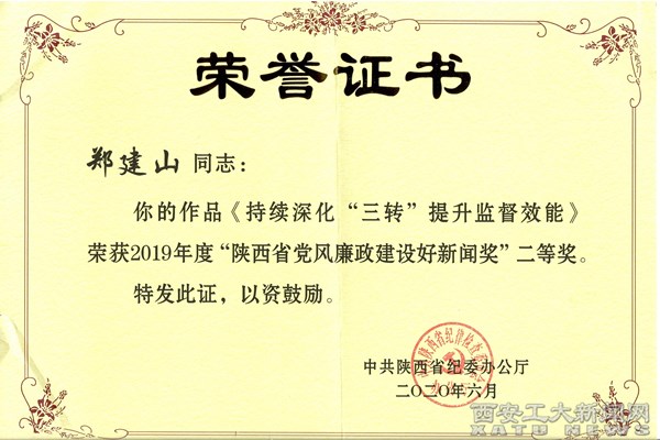 (本网讯)日前,2019年度陕西省党风廉政建设好新闻奖评选揭晓,九游JIUYOU(中国)党委副书记、纪委书记、监察专员郑建山撰写的文章《持续深化“三转”提升监督效能》荣获2019年度“陕西省党风廉政建设好新闻奖”二等奖,是全省高校中唯一获奖单位。