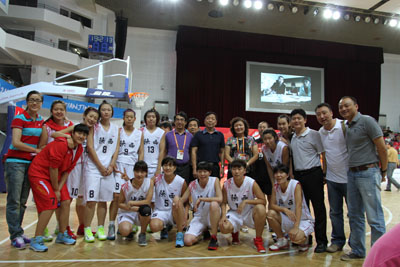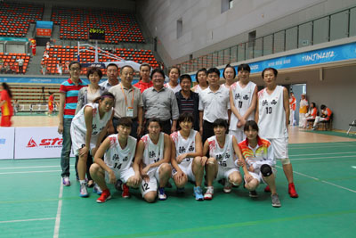 省委教育工委副书记郝利生(二排右六)、省教育厅体卫艺处处长祝亚肖(二排右五)看望慰问女篮队员