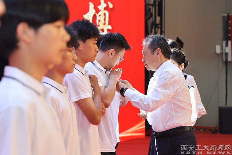 侯成义为新生代表佩戴校徽。