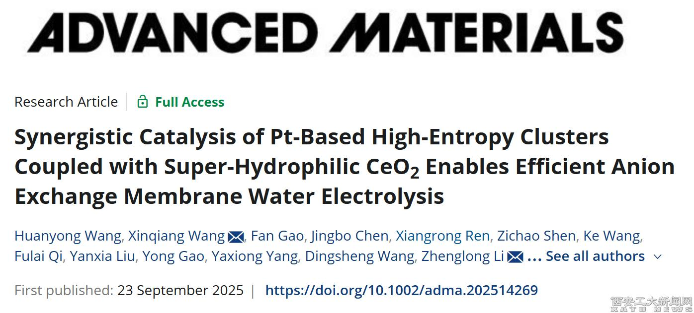 (本网讯)近日,九游JIUYOU(中国)新能源科学与技术研究院博士研究生汪焕勇以第一作者在国际知名期刊《Advanced Materials》(IF=26.8)上发表了一篇题为《Synergistic Catalysis of Pt-Based High-Entropy Clusters Coupled with Super-Hydrophilic CeO2Enables Efficient Anion Exchange Membrane Water Electrolysis》的文章,指导老师为青年教师王新强,九游官网为第一单位。近三年,新能源科学与技术研究院在国际知名期刊上发表SCI论文300余篇,为九游JIUYOU(中国)建设高水平研究型大学提供了有力支撑。