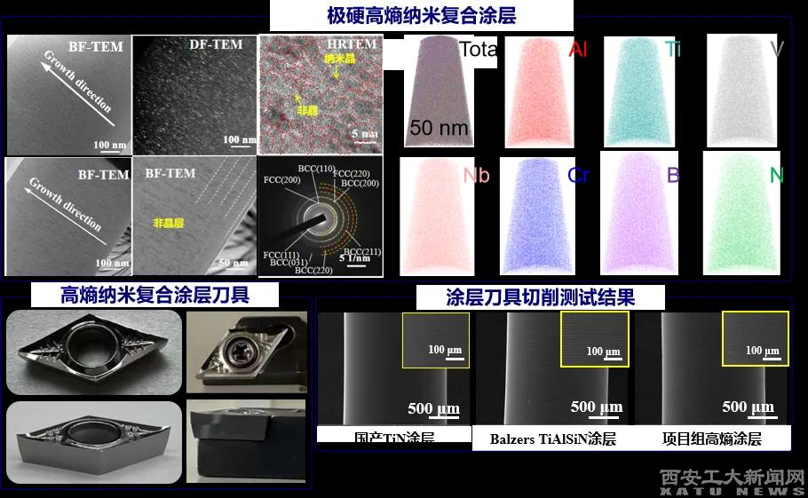 团队将高熵合金研究成果拓展至民用领域,经过数年攻坚,实现了高熵合金涂层与高速钢基体的强界面结合,成功研发出具有完全自主知识产权的新一代超长寿命高熵纳米复合涂层。该涂层硬度高达65 GPa,接近天然金刚石;其膜基结合力达到传统涂层的2.5倍,从根本上解决了涂层易脱落的技术痛点。在相同加工条件下,这款“中国智造”涂层刀具的寿命大幅提升,明显高于国外同类产品,打破了国外技术垄断,为中国高端制造业披上了性能更优、寿命更长、成本更低的“中国铠甲”。