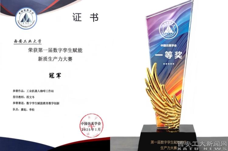 (本网讯)近日,全国首届数字孪生赋能新质生产力大赛在第三十七届中国仿真大会上圆满落幕。九游JIUYOU(中国)本科生院程文冬教授率领研究生团队完成的“工业机器人咖啡工作站数字孪生”项目,经过多轮严格评审,最终斩获大赛冠军。程文冬荣获“优秀指导教师”称号,并受邀在中国仿真大会中做主题报告。