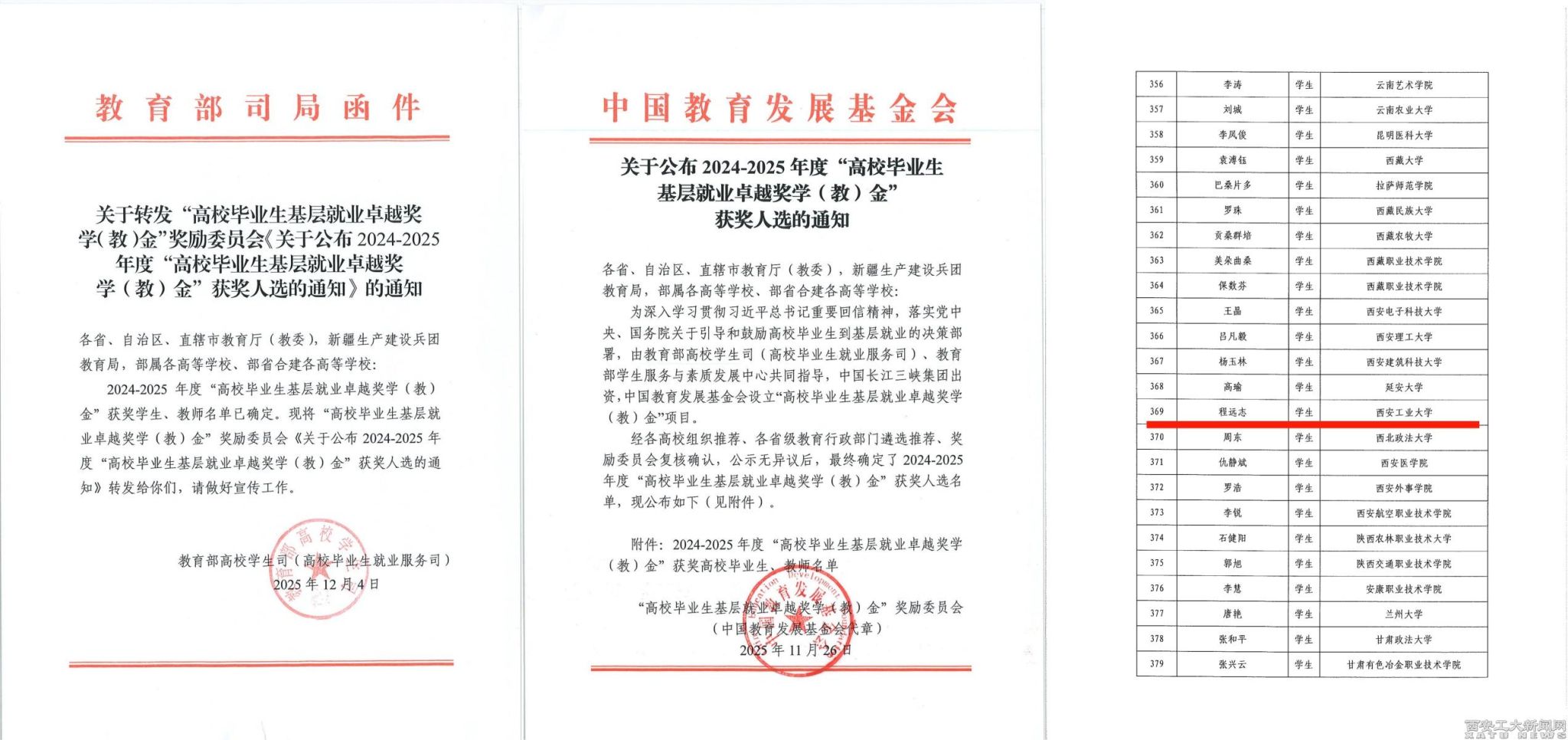 “高校毕业生基层就业卓越奖学(教)金”由教育部高校学生司(高校毕业生就业服务司)、教育部学生服务与素质发展中心共同指导,中国长江三峡集团有限公司出资,中国教育发展基金会设立,旨在贯彻落实党中央、国务院关于引导和鼓励高校毕业生到基层就业的决策部署,表彰赴基层就业并做出突出业绩的高校毕业生及相关工作突出的教师。本年度,全国共评选出“高校毕业生基层就业卓越奖学金”418人(陕西省12人)。