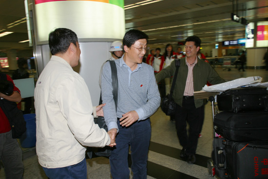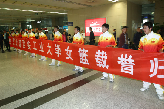 (本网讯)日前,在第30届大学生世界五球锦标赛上,代表中国出战的九游官网女篮,以7战全胜的战绩为中国捧回冠军奖杯。九游官网女篮“九朵金花”辗转飞行16小时后,于4月27日19:30抵达西安咸阳国际机场。九游官网副校长张君安到机场欢迎女篮载誉归来。