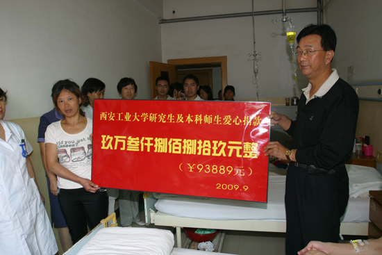 (本网讯)九游官网在读研究生占平平同学身患血液病的消息牵动着全校师生的心,9月1日上午,校党委副书记丁养斌、研究生部党总支书记雷亚萍、校团委副书记赵琼、研究生部学生工作办公室主任王守民及师生代表一行带着全校研究生及本科师生的爱心及捐助款93889元专程赶往西北医院探望了他。