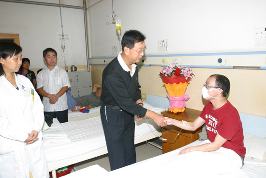 丁养斌副书记仔细询问了占平平同学的近期状况后,转达了学校对占平平同学及其家人的问候并叮嘱他要积极配合医院坚持治疗。他还特别鼓励占平平同学要树立战胜病魔的信心,早日康复回到同学们当中。随后,丁副书记亲手将全校师生的爱心捐款9万余元交到占平平母亲手中。研究生代表和本科生代表分别向占平平送上鲜花,并祝福他早日康复。
