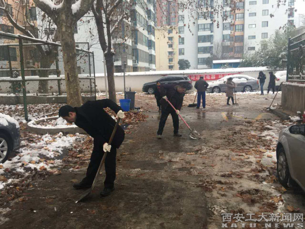 (本网讯)1月6日清晨,2018年的第二场雪扑面而来。由于气温骤降引起道路积雪结冰,使师生出行少了一份对雪的憧憬与喜悦,却多了一些对出行的担忧与紧张。学校总务处积极响应西安市政府“抓紧各扫‘门前雪’,一分一秒也不可耽误”的号召,迅速启动应对恶劣天气应急预案,在金花、未央两校区积极开展雪后应急工作,全力保障广大师生员工平安出行。