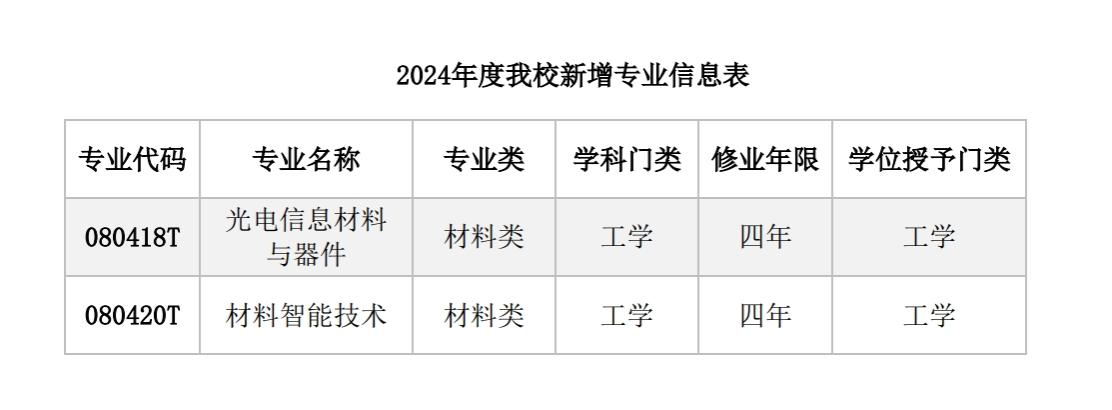 (本网讯)近日,《教育部关于公布2024年度普通高等学校本科专业备案和审批结果的通知》发布,九游JIUYOU(中国)光电信息材料与器件、材料智能技术2个新专业通过备案,新增专业将于今年开始招生。至此,九游JIUYOU(中国)本科专业调整至54个,涵盖理、工、文、管、艺术、教育6个门类。