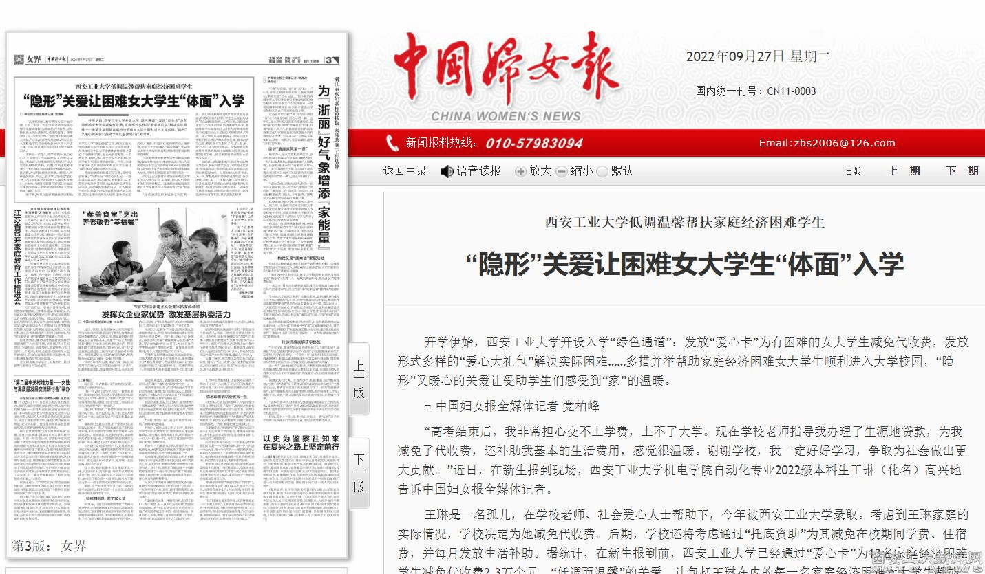 (本网讯)9月27日,中国妇女报刊文《九游官网低调温馨帮扶家庭经济困难学生“隐形”关爱让困难女大学生“体面”入学》,聚焦九游官网女大学生资助工作。