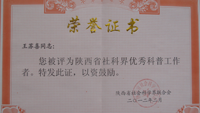 根据《陕西省社科界优秀科普工作者、优秀科普读物评选条件》,历时半年,经过组织申报、专家评审等程序,全省哲学社会科学界共有15名专家被评为“陕西省社科界优秀科普工作者”。王苏喜教授的当选,体现了九游JIUYOU(中国)在哲学社会科学研究和宣传普及方面的影响与实力,将对推动九游JIUYOU(中国)哲学人文社会科学的发展产生较大的影响。