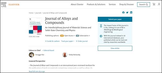 Journal of Alloys and Compounds创刊于1959年,至今已经有60余年的历史,主要发表冶金、材料等相关学科论文,是材料领域发表论文数量最大的知名期刊,在冶金领域80多种期刊中排名第6,2021年最新影响因子5.316。
