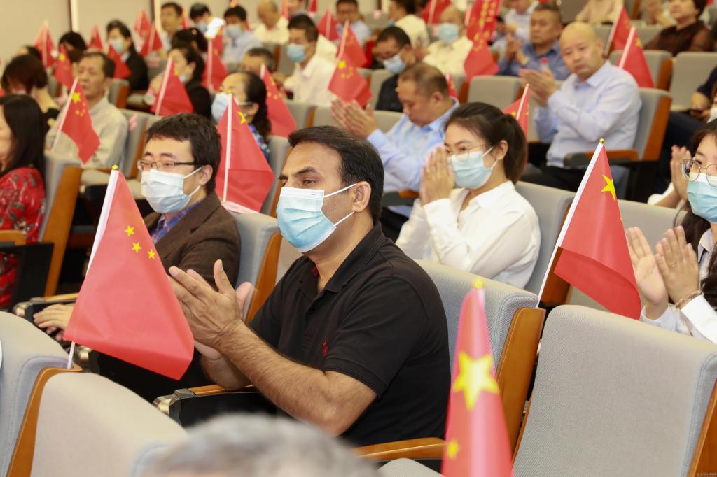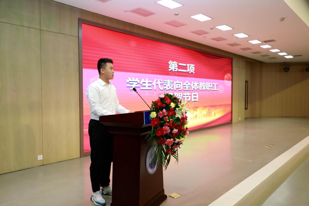 在庄严的国歌声中,大会正式拉开帷幕。基础学院2019级学生贾立瑾代表全校学生向全校教职工表达节日祝福和感谢。
