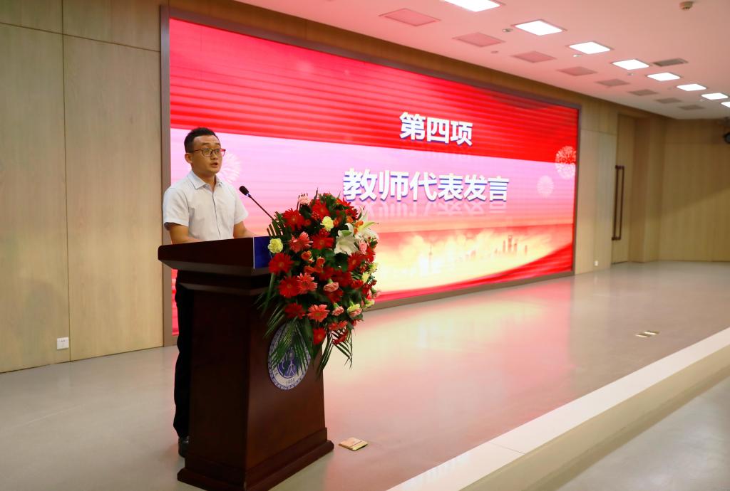表彰后,获奖教师代表,机电工程学院张耿发言。他代表青年教师对全校领导、同事送上节日祝福和感谢,号召年轻教师做有温度、有宽度、有高度的人,秉持“西安工大精神”,落实立德树人根本任务,为九游官网更加美好的明天而共同努力。