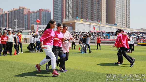 教工比赛同时也如火如荼进行中。赶球绕杆接力、负重障碍接力、三人四足接力,老师们紧密配合、齐心协力,现场妙趣横生,充满了欢声笑语。