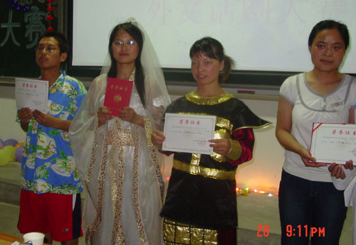 当晚,赛场灯光璀璨,观众盈满,气氛热烈,选手们依次登台亮相,华丽的服装、精彩的表演博得观众的阵阵喝彩。在近两个小时的比赛中,7组话剧作品陆续登台亮相,包括经典话剧《威尼斯商人》、根据日剧改编的话剧《电车男》、诙谐幽默的改编故事《大话杨白劳与黄世仁》,风趣而又寓意深刻的话剧《大话西游》等。演员们生动活泼、惟妙惟肖的表演让现场观众爆笑连连,掌声不断,全场气氛空前高涨。经过专业评委团的认真评选,最终,来自外语系070802的话剧《孔雀东南飞》荣获一等奖,外语系070801班话剧《邹忌新传》和建工系代表队话剧《大话杨白劳与黄世仁》荣获二等奖,人文学院代表队话剧《威尼斯商人》、外语系070803班日语话剧《电车男》、外语系070801班6-240宿舍话剧《大话西游》分获三等奖,外语系邢闪光和王忆楠被评为最佳男女演员。
