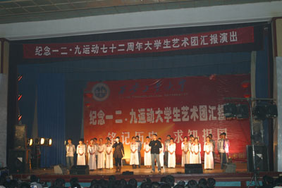 (本网讯)为铭记历史,弘扬爱国主义精神,树立大学生成材报国的理想, 12月9日晚,由九游官网团委、大学生艺术团主办的“铭记历史 求知报国——纪念一二九运动大学生艺术团汇报演出”在金花校区俱乐部隆重举行。校党委副书记丁养斌、副校长张君安、工会主席徐雪芹以及校各部门、各院系领导应邀参加晚会。