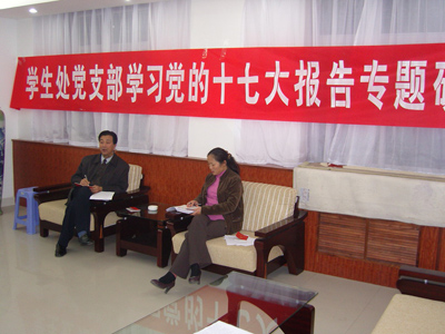 学生处党支部书记任慧英主持这次活动。首先,她组织大家重点学习了十七大报告中的十五个新观点,还组织大家学习了本学期党支部的工作计划和《劳动法》,并进行讨论交流。