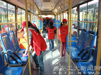 志愿者们作为交通安全志愿协管员在人流量较大的十字路口进行交通过往人流疏导,并免费向市民发放了精心编制的《新交规学习手册》。志愿者们还随600路车队工作人员上车,对乘客进行了以“绿色出行 缓堵保畅 从你我做起”为主题的宣讲活动。同时,志愿者们在公交六公司600路调度站进行了“保持公交卫生 创建城市文明”的公交卫生维护工作,对公交车内外进行了彻底地清洁,使多辆公交车焕然一新。