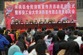 11月9日下午的未央校区经纬广场,彩旗飘舞、人头攒动,未央区所属8个街道办和8个重点防火单位代表,西安工大1000余名师生,未央区政府、西安市公安局文保支队、西安市公安消防支队、西安工大相关领导共同参加了本次活动。