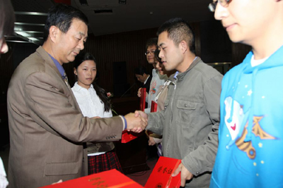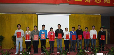 在激昂的颁奖乐曲中,丁养斌副书记和校学生工作领导小组成员部门领导为获奖集体和个人代表颁奖。材料与化工学院的学生果志伟同学和经济管理学院获得090503班学生吴思思同学分别代表十佳大学生和优良学风班做了《厚积 成长 远航》的十佳大学生风采展示和班级情况介绍。