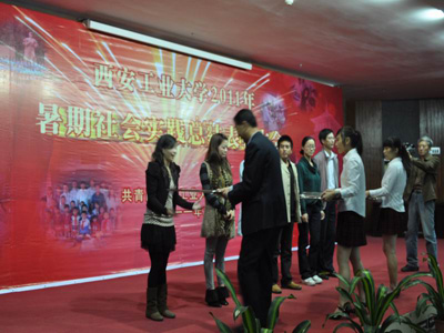 短片结束后,学工部部长、学生处处长任慧英宣读了《关于对2011年学暑期社会实践活动先进集体和个人进行表彰的决定》,大会对各先进集体和个人获奖代表进行了颁奖。随后,人文学院李亚、材化学院余颖淼、经管学院宋国涛、光电学院黄超等获奖学生代表上台发言,他们分别从红色革命之旅、乡村支教、个人自主实践、服务西安世园会等不同侧面与大家分享、交流了心得体会;同时,世园会志愿者代表还为大家带来了一场短幕话剧,讲述他们在服务西安世园会期间的故事。