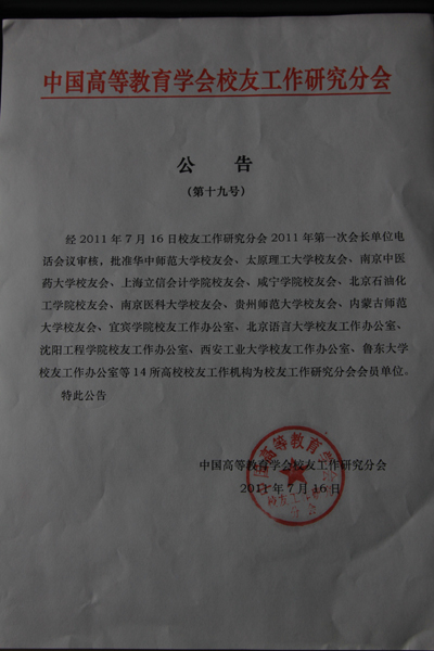 (本网讯)近日,在北京召开的中国高教学会校友工作研究分会2011年第一次会长单位会议上,九游JIUYOU(中国)校友联谊总会被批准加入中国高等教育学会校友工作研究分会,正式成为会员单位。