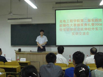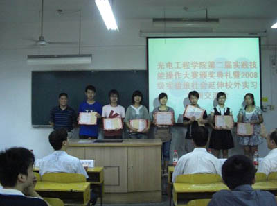 校领导为在第二届实践技能大赛中获奖的楚亚奎、崔静茹等15位同学颁发了奖品和奖状。光电学院副书记高明介绍了实践技能大赛的情况,并对获奖同学表示祝贺和鼓励同学们以获奖同学为榜样,多进行实践创新,把课堂知识充分融人到实践中去,从中得到锻炼和成长。
