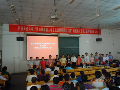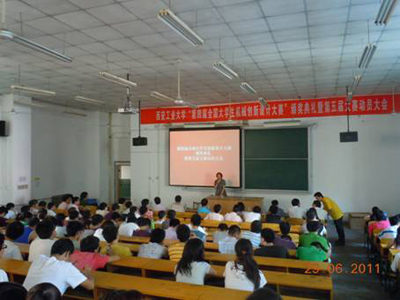机电学院副院长、第五届“全国大学生机械创新设计大赛”陕西省赛区组委会委员刘波传达“第五届全国大学生机械创新设计大赛”有关情况。“第五届全国大学生机械创新设计大赛”于2011 年5 月14 日正式启动,其主题为“幸福生活——今天和明天”;内容为“休闲、娱乐机械和家庭用机械的设计和制作”。刘院长说,第五届大赛决赛时间为2012年7月下旬,时间紧,任务重,希望全校有志于参赛的学生和教师争分夺秒,夺取佳绩。