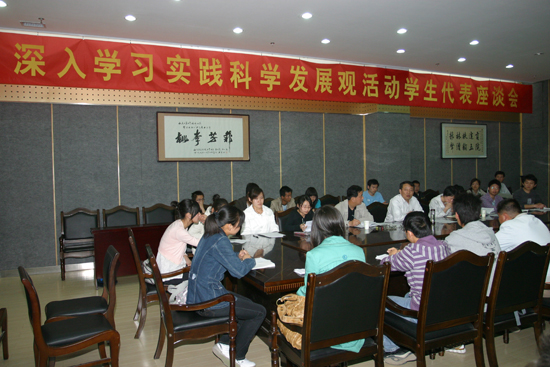 参会学生代表结合自身思想、学习、工作、生活等实际情况,围绕学校在开展深入学习实践科学发展观活动中如何更好地服务大学生健康成长、成才畅谈自己的感受和体会,重点就学校发展建设、大学生就业创业、目标教育及非专业素质教育等方面提出了中肯的意见和建议。同学们认为,学校在育人过程中要紧密结合学生现实和长远需要,主动设计创造有利于学生成长、成才各种平台的机会,让学生在良好的校园环境和学习氛围中主动学习、施展才华、积极实践,为走上社会打下扎实的基础。
