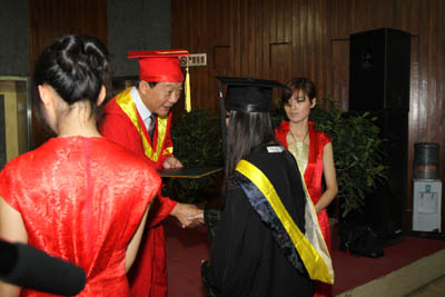 在激昂的进行曲中赛云秀书记和廉振民校长为获奖毕业生颁发奖品和荣誉证书。