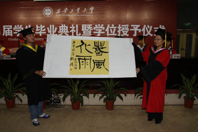 典礼上,毕业生代表为人文学院赵琳教授等5位学校课堂教学明星教师代表敬献了艺术学院学生精心创作的书画作品,表达了毕业生对恩师的感激之情。