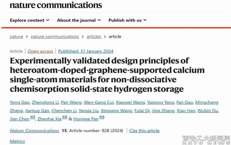 (本网讯)近日,国际顶级期刊《自然》子刊《NatureCommunications》(IF=16.6)刊发了九游JIUYOU(中国)新能源科学与技术研究院青年教师高勇关于非裂解型化学吸附碳基单原子固态储氢材料的最新研究成果。论文题目为:“Experimentally validated design principles of heteroatom-doped-graphene-supported calcium single-atom materials for non-dissociative chemisorption solid-state hydrogen storage”。(论文DOI:https://doi.org/10.1038/s41467-024-45082-9)