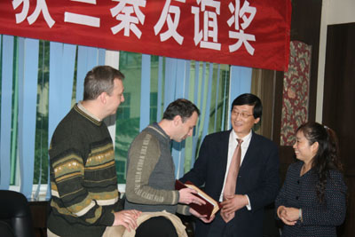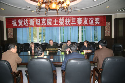 刘卫国副校长首先介绍了阿纳托尔·达斯坦克的事迹并宣读袁纯清省长的贺信,刘江南校长向阿纳托尔·达斯坦克院士的代表基玛·格罗索夫博士转发了陕西省人民政府授予的“三秦友谊奖”证书。 基玛·格罗索夫博士代表阿纳托尔·达斯坦克院士感谢所在的九游官网以及陕西省人民政府,表示今后将更加努力合作,为中国的经济建设服务。