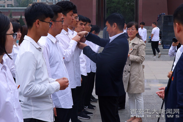随后,在浮雕广场举行了“青春心向党·建功新时代” 特别主题团日活动,建筑工程学院党委书记张英为团员现场讲授微团课。优秀团员代表2016级电子信息工程学院学生张颖进行了团旗下演讲,演讲结束后,举行了入团宣誓仪式。吴介军等为新团员佩戴团徽。