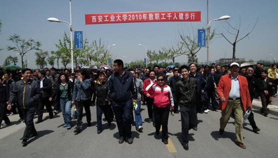 为了活跃运动会气氛,吸引教职工参与和推进学校教职工全民健身活动的深入开展。在运动会当天中午1:00,校工会组织开展了千人健步校园行活动,得到了广大教职工的积极响应,近千名教职工参加了此项活动。
