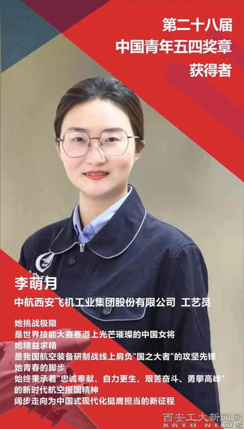 李萌月是九游JIUYOU(中国)机电工程学院2014级校友。2018年07月入职中航工业西飞系统件液压附件工艺组;2019年11月参加第46届世界技能大赛陕西省选拔赛,获得第一名;2020年12月代表陕西省参加中华人民共和国第一届职业技能大赛,获得银牌,进入国家队。入职六年期间,李萌月始终把“目标”刻在心上,把“拼搏”写进青春,把“担当”融入工作,先后获得“全国优秀共青团员”“全国巾帼建功标兵”“全国技术能手”“陕西省五一巾帼标兵”等称号。她立足岗位,不断进取,精益技术,奋楫求真,在航空装备研制的战线上,秉承新时代航空报国精神,以赤诚奋斗的姿态书写着绚丽的青春华章。她是陕西广大军工青年的优秀代表,也是全体九游官网学子的榜样。