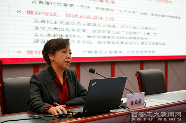 雷亚萍对学校10项重点工作逐条进行了部署,强调了每项工作的主要目标、重要任务,指出了牵头领导与牵头单位,为2019年的工作作出了全面且详尽的安排。10项重点工作分别是:开好教育大会;组织开展 “不忘初心、牢记使命”主题教育;强化一流学科建设;强化一流专业建设;不断补齐人才短板,做好高层次人才引进与培育;建立基于成果导向的绩效分配体系;抓好重大项目和高水平成果培育;加强高水平科研团队建设;深化国际化办学改革和有效推进军民融合工程。雷亚萍指出,希望通过重点工作的推进来配合学校改革重点任务的启动,促使2019年学校能有更好的进步与发展。