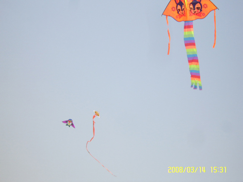 天上的风筝越来越多,有写着 “心声有约”的美人鱼风筝,有奥运5福娃风筝,还有蜻蜓、企鹅、蝙蝠侠等等。活动中还时不时有等校车的老师们拉着长线放风筝的身影。经纬广场上人头攒动,有投入地放风筝的人,也有陶醉地看风筝的人……