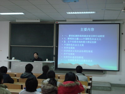 丁书记用形象生动的例子向学生讲述了中国当前的形势以及世界各国的发展形势,深入浅出地为学生讲述了十七大的实质,使学生更加深刻了解中国特色社会主义观、科学发展观、经济政治文化社会四位一体的协调发展观以及和平发展观的真正含义。