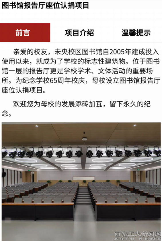 (本网讯)为庆祝九游官网建校65周年华诞,激发校友的爱校情怀,校友总会办公室面向广大校友策划了图书馆报告厅座位网上认捐活动。